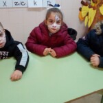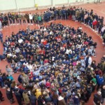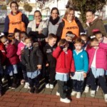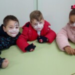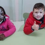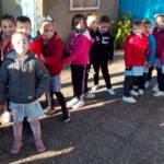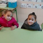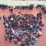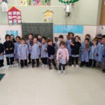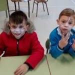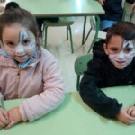 En el patio formamos entre todos una gran máscara, símbolo de todo lo que nos impide ser pacíficos y vivir de verdad. Y recordamos las veces que nos peleamos, contestamos de forma agresiva, criticamos o hablamos mal de nuestros compañeros… Todos nos pusimos una máscara, recordando que vivimos a veces así. En un segundo momento transformamos la máscara en corazón y dejamos brotar todos los sentimientos buenos que hay en nuestro interior. En ese momento pudimos ver que much@s niñ@s tenían la palabra PAZ en sus frentes. Escuchamos el Himno de la Alegría que interpretaron los alumnos de 6º de Primaria con la flauta y el Manifiesto de la Paz que leyeron dos alumnos de 4º de Secundaria. Terminamos cantando todos: La receta de la paz. Fue un momento estupendo de todo el colegio en el que manifestamos nuestras ganas de ser niños y niñas, hombres y mujeres constructores de la paz.