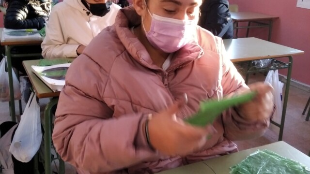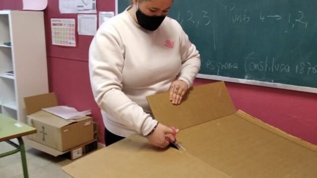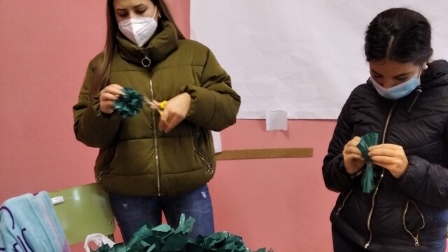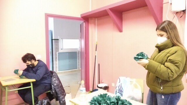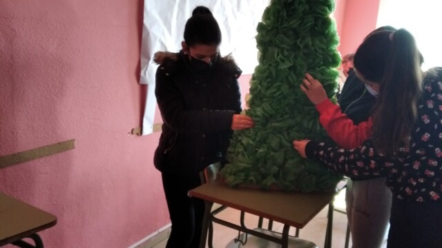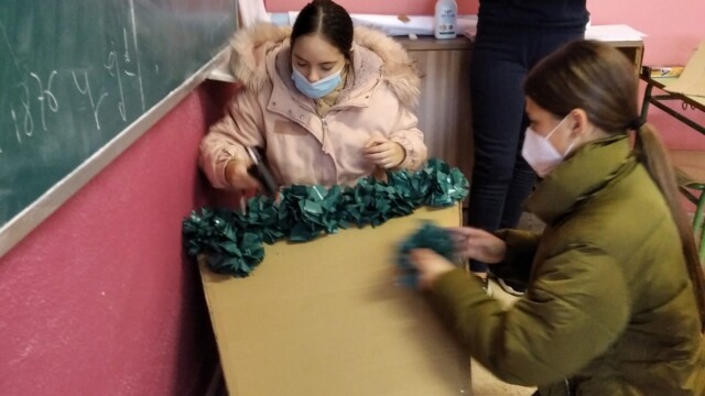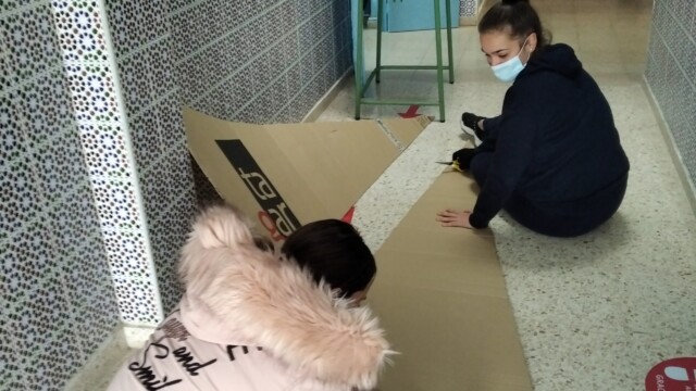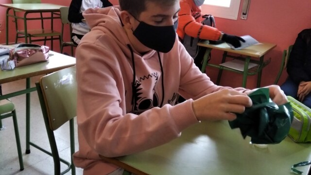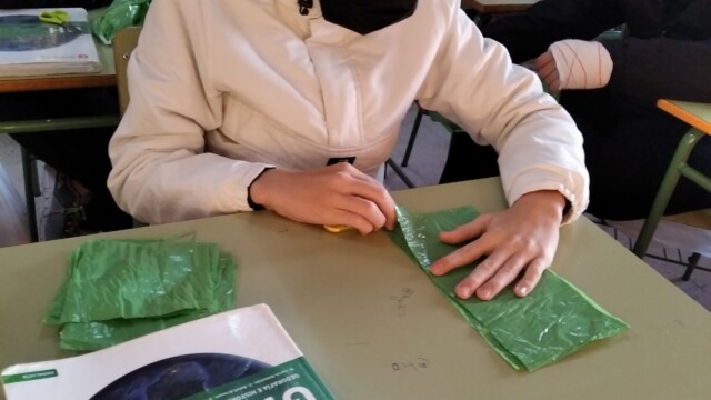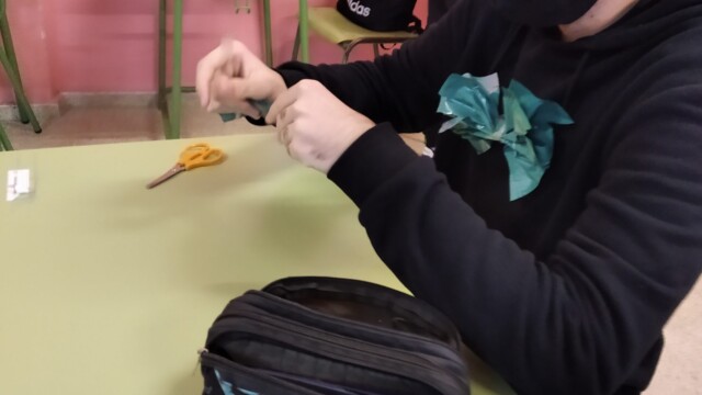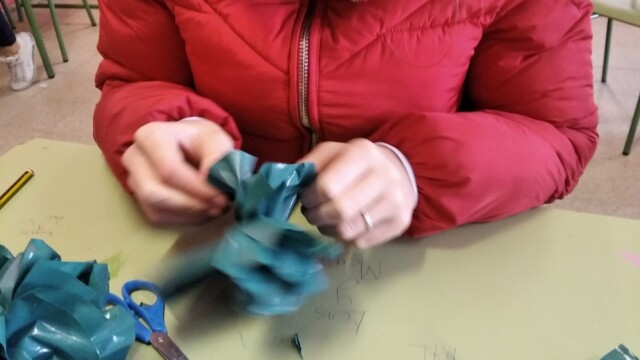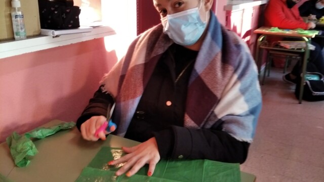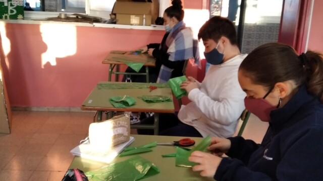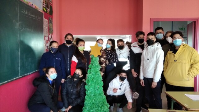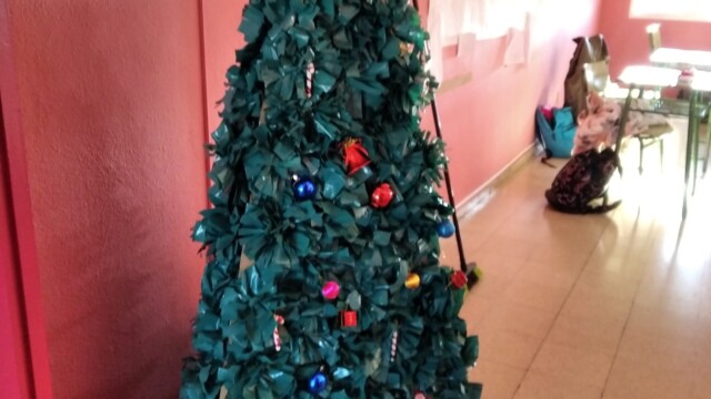 Para ello, a principios de diciembre, empezamos a compartir qué podíamos hacer; les mandaríamos una carta y alguna foto para que nos conozcan. Pero no una foto cualquiera ¡teníamos que hacer algo especial! Y realizamos un árbol de navidad que ambientara nuestra foto. Así pues, ¡manos a la obra! Cartón, bolsas de plástico, tijeras…