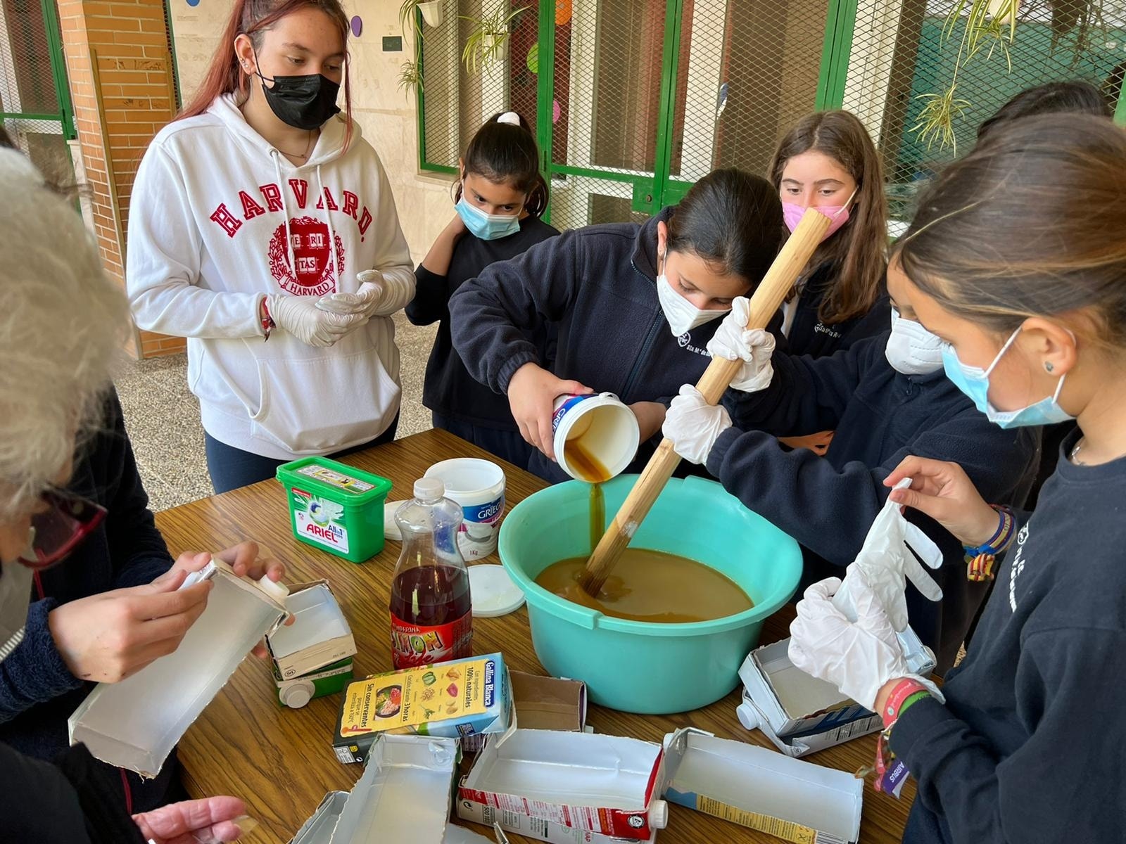 El pasado jueves en los #GruposBarat l@s niñ@s aprendieron a hacer jabón con el aceite usado que habían traído al colegio.
